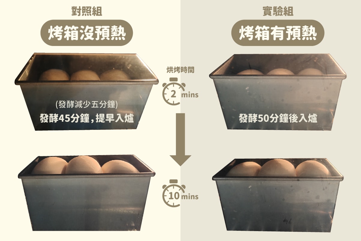 1.烤箱沒有預熱的情況下,會從發酵溫度35度開始加熱,也就是烘烤的時間會增加了發酵的過程約2-3分鐘,而且是比較高溫的發酵,使麵包又再長高一點。