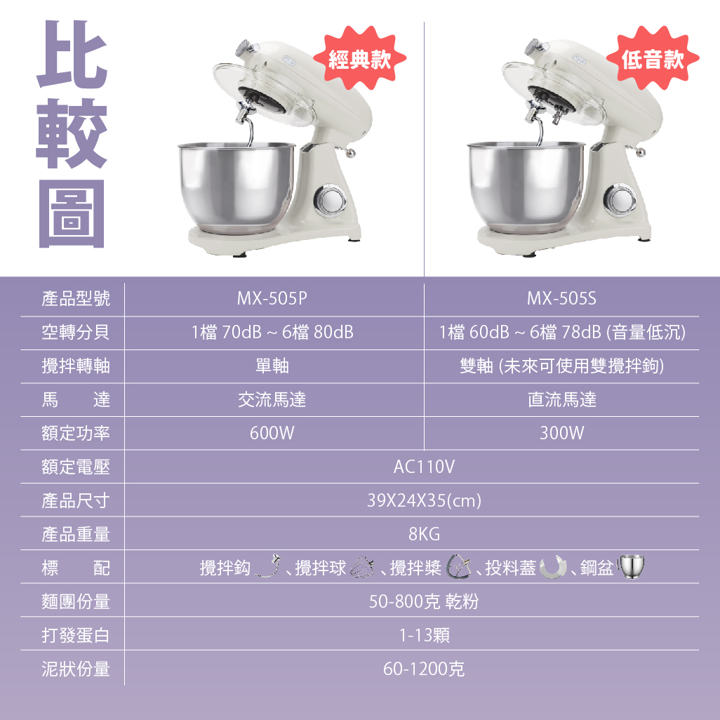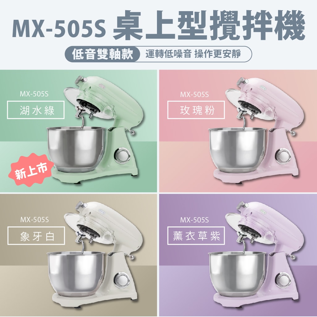 | 商品選項 | MX-505P攪拌機-天空藍, MX-505P攪拌機-蜜桃紅, MX-505P攪拌機-象牙白, MX-505P攪拌機-玫瑰粉, MX-505S攪拌機-薰衣草紫, MX-505S攪拌機-玫瑰粉, MX-505S攪拌機-象牙白, 【預購】MX-505S攪拌機-象牙白+送保冷袋1, 【預購】MX-505S攪拌機-玫瑰粉+送保冷袋1, 【預購】MX-505S攪拌機-薰衣草紫+送保冷袋1, MX-505S攪拌機-湖水綠, 【加購】【KitchenAd適用】505P壓麵皮器, 【加購】【KitchenAd適用】505P壓麵條器(粗), 【加購】【KitchenAd適用】505P壓麵條器(細), 【加購】【KitchenAd適用】505P多功能切菜器, 【加購】【KitchenAd適用】505P絞肉(灌腸)器, 【配件】7公升鋼盆, 【配件】保冷(溫)袋, 【配件】矽膠刮板攪拌槳, 【配件】不鏽鋼攪拌槳, 【配件】鐵氟龍攪拌槳 |