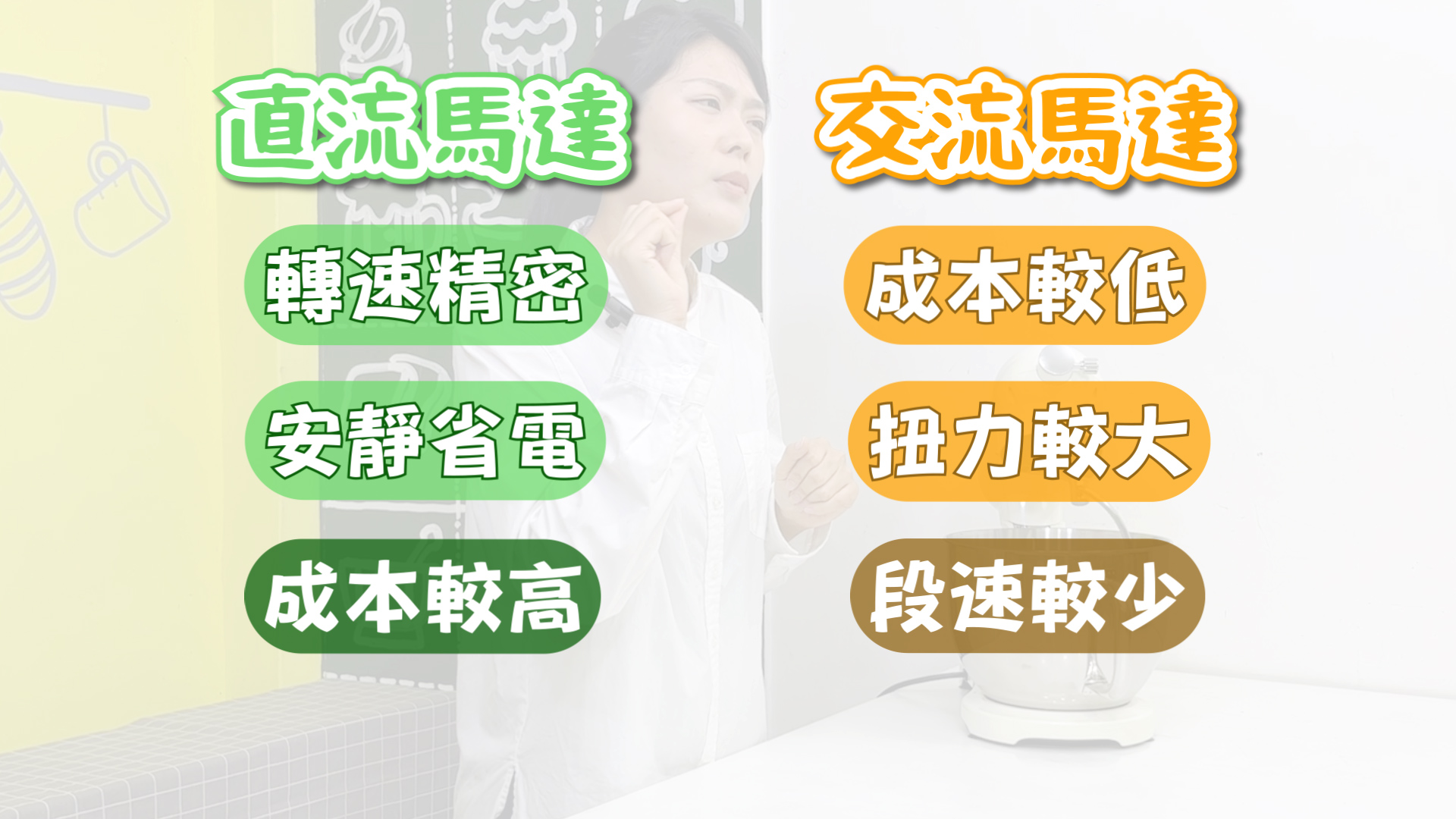 馬達分成交流馬達與直流馬達,未來攪拌機的趨勢比較可能是往直流大扭力的方向發展,但不表示直流的馬達比較好。