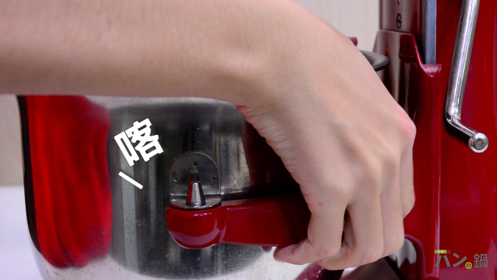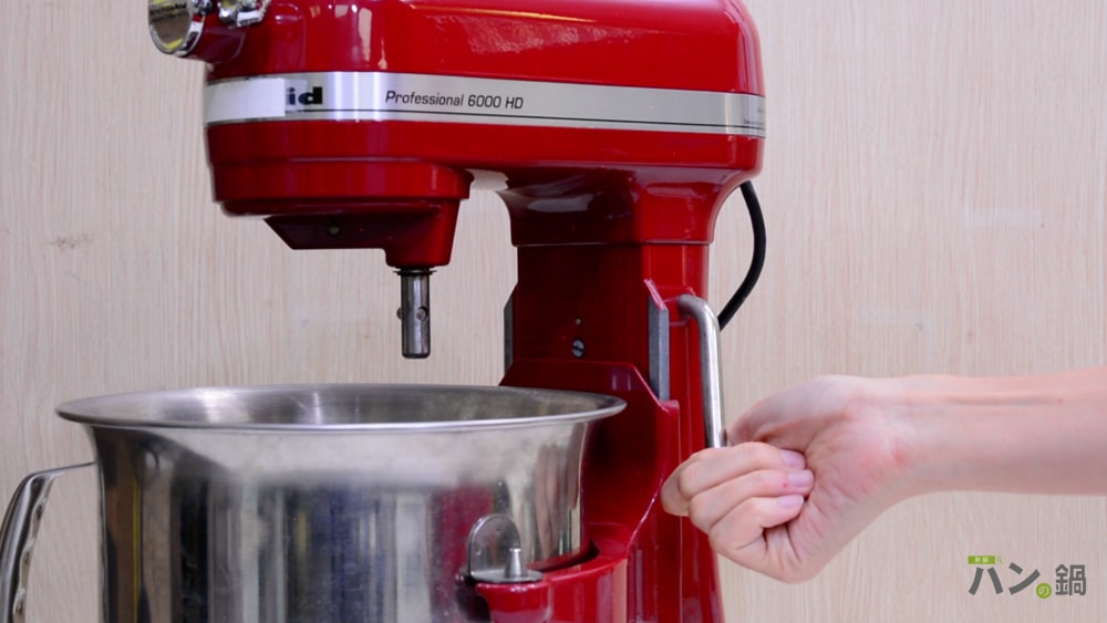 看它側邊有一個把手就是升降的把手,將鋼盆裝好之後就可以升起開始使用。過程中如果要刮剛、投料、或是更換攪拌器,只要將鋼盆下降就可以操作。