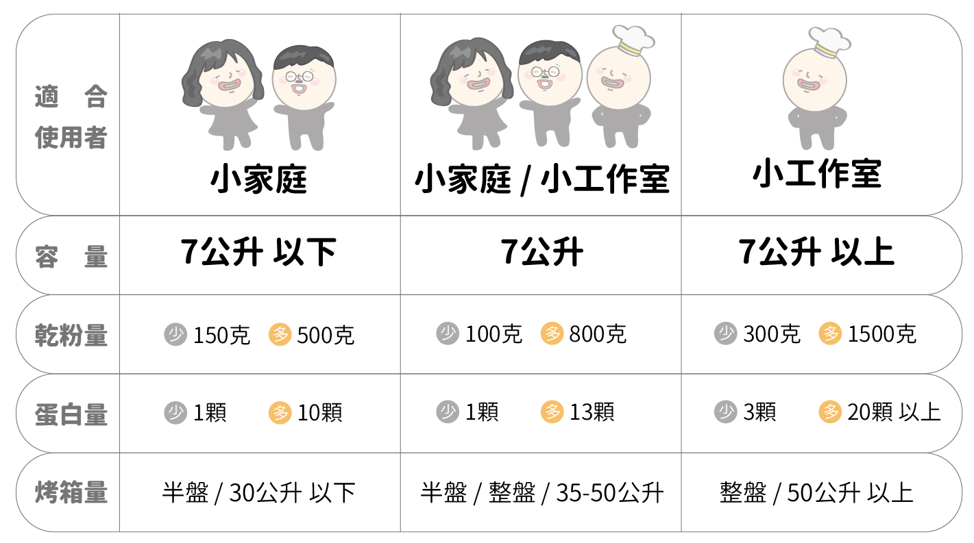 【7公升以下的攪拌機】會比較適合一般小家庭,因為一次能攪打的份量比較少